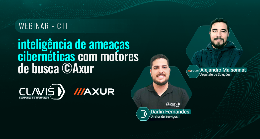 Lançamos um webinar abordando a importância do Cyber Threat Intelligence (CTI) para as organizações. Para isso, Darlin Fernandes, diretor de serviços da Clavis, junto a Alejandro Maisonnat, arquiteto de soluções da Axur, abordaram os desafios de segurança no cenário atual.