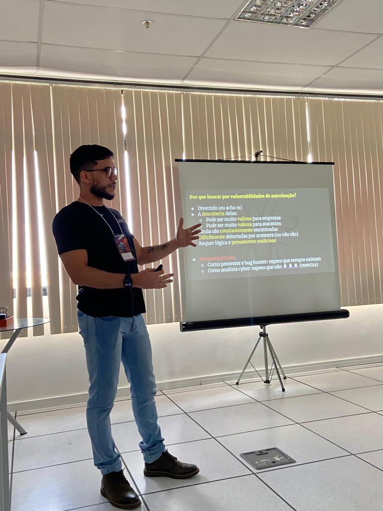 Paulo Mota, nosso analista de segurança ofensiva, apresentou a palestra “WebApp Hacking Methodology: explorando vulnerabilidades de autorização em empresas de escala global”. Ele discutiu sobre a metodologia para identificar vulnerabilidades de autorização em aplicações web reais.