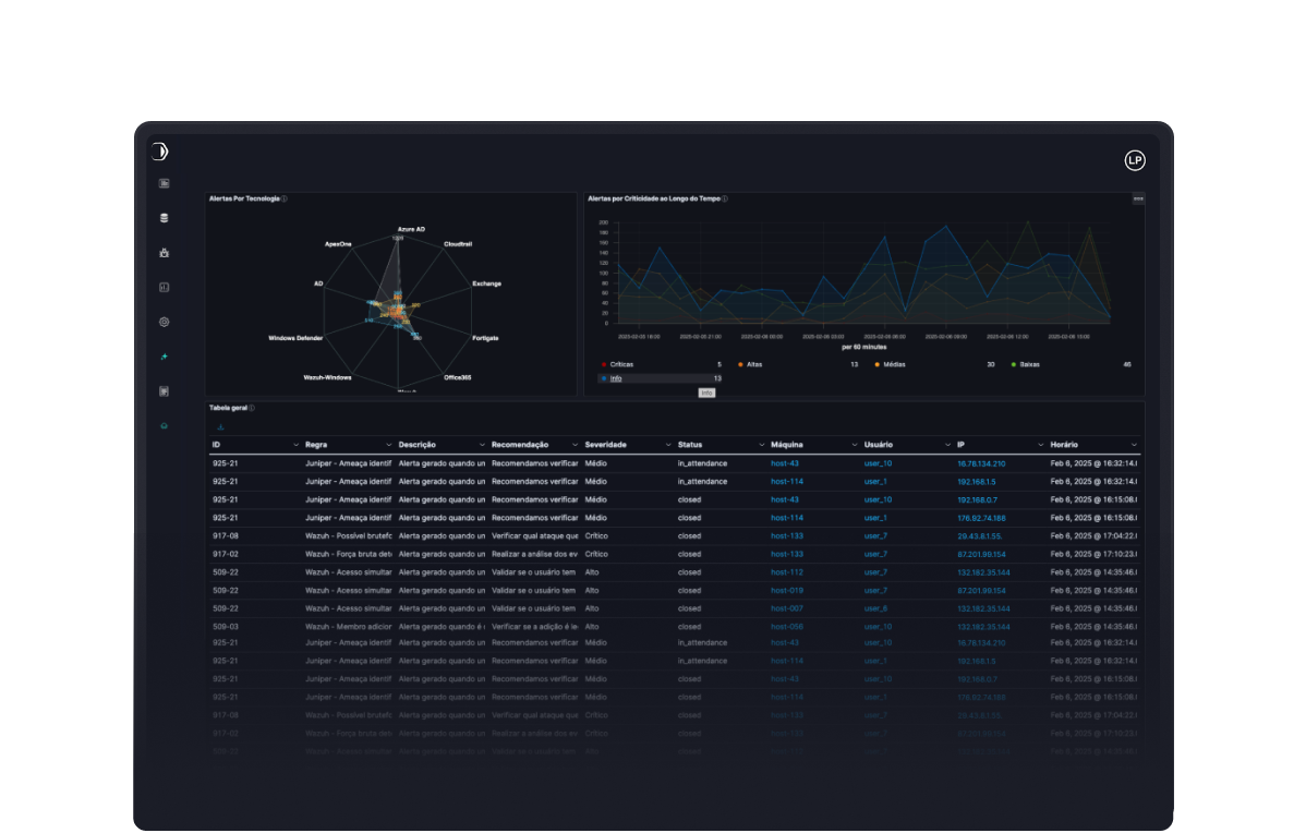 - Cobertura abrangente: identificação de diversas ameaças, como vazamento de informações sigilosas, comportamento inadequado de colaboradores, divulgação de vulnerabilidades, entre outros.